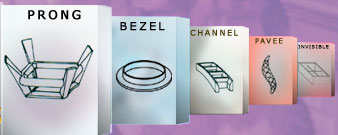 and protect possible damages trough the wearer from depend on the type and shape of gemstones and determinant by the design of object or jewelry the stone are set.There are 6 main technics of setting 1. Prong 4. Channel 2. Bezel 5. Pavee 3. Gypsy 6. Invisible There are newer technics: Tension. General setting rules. a. Facetted, transparent stones In order to show the |